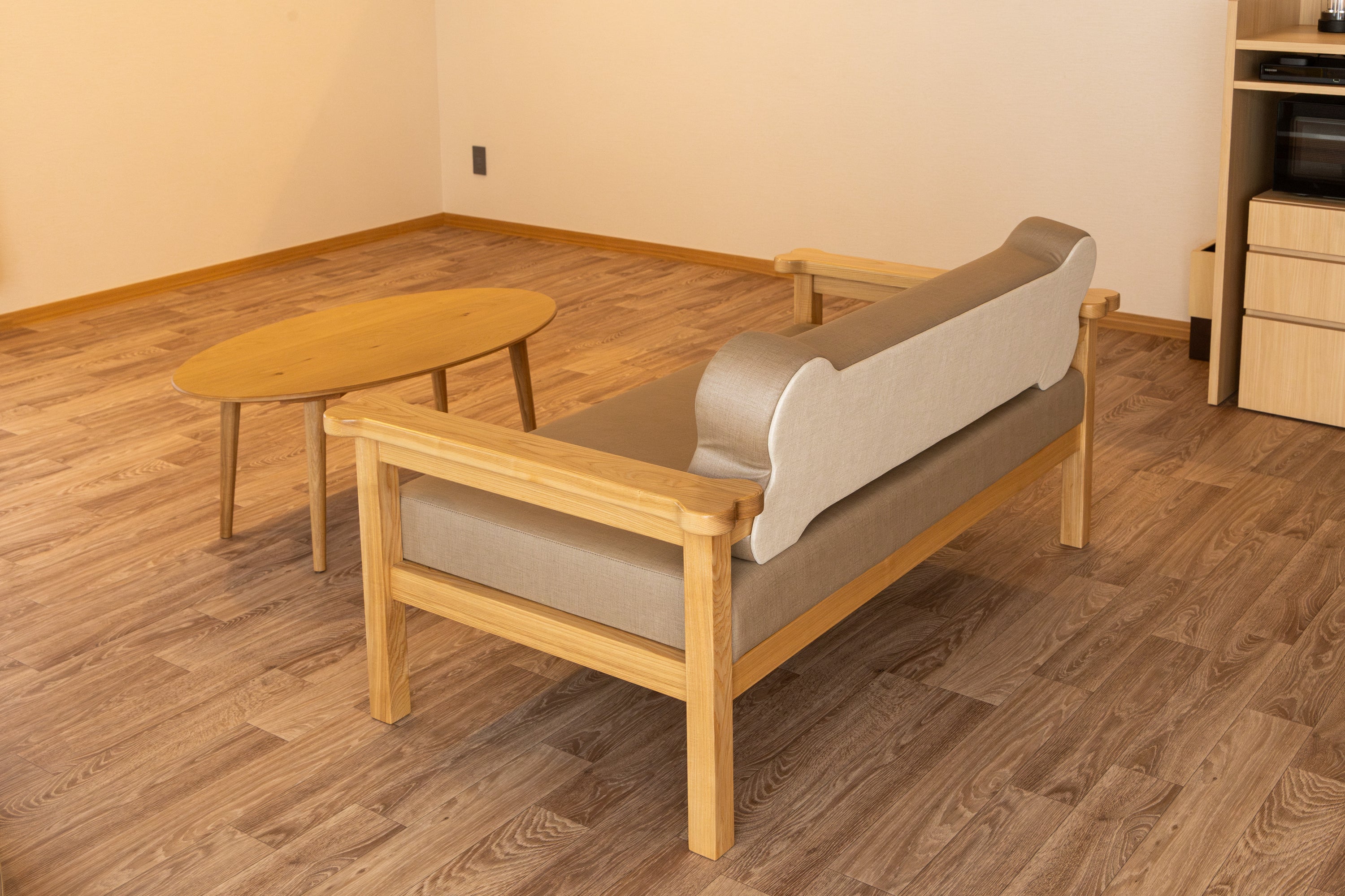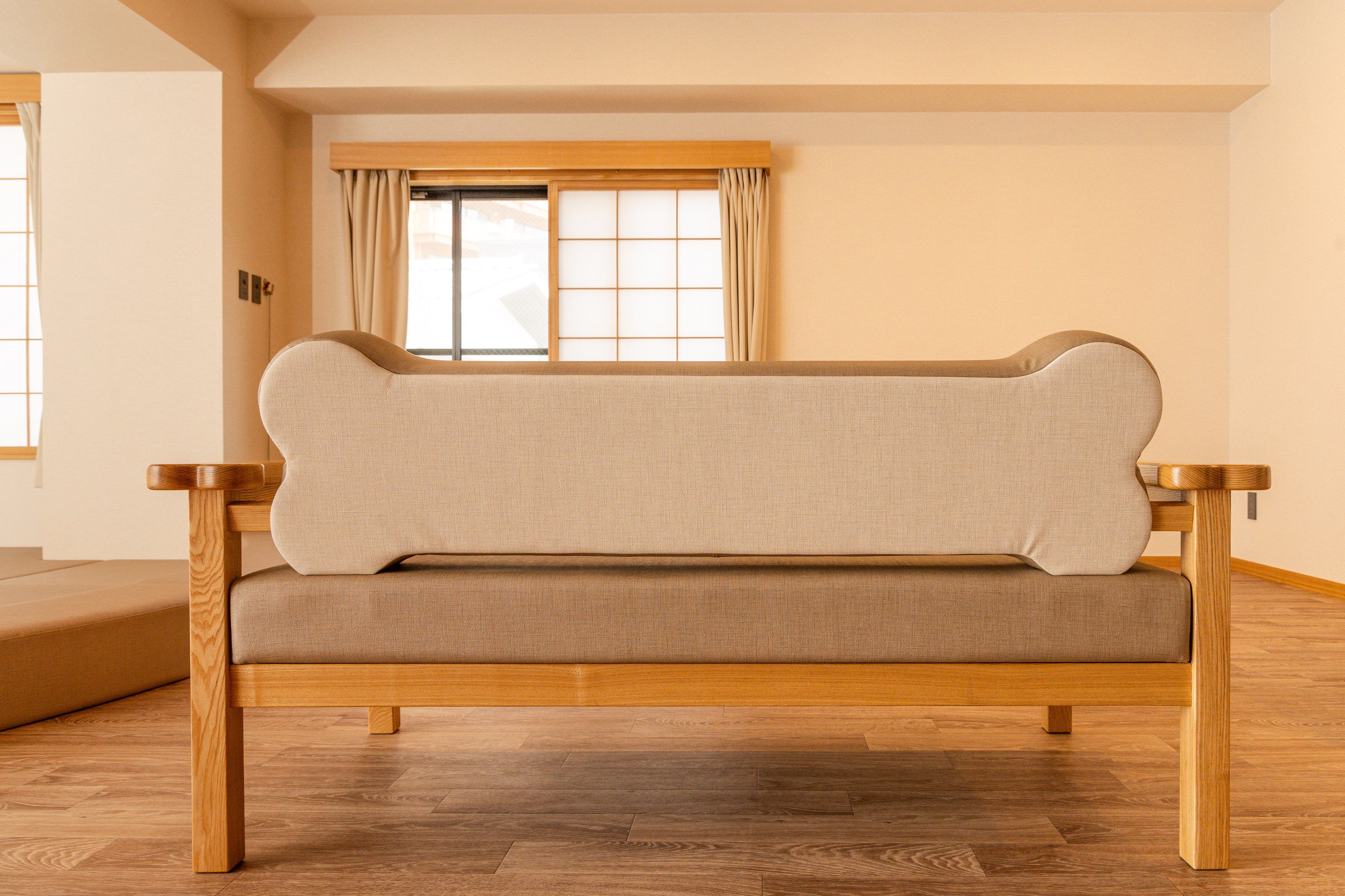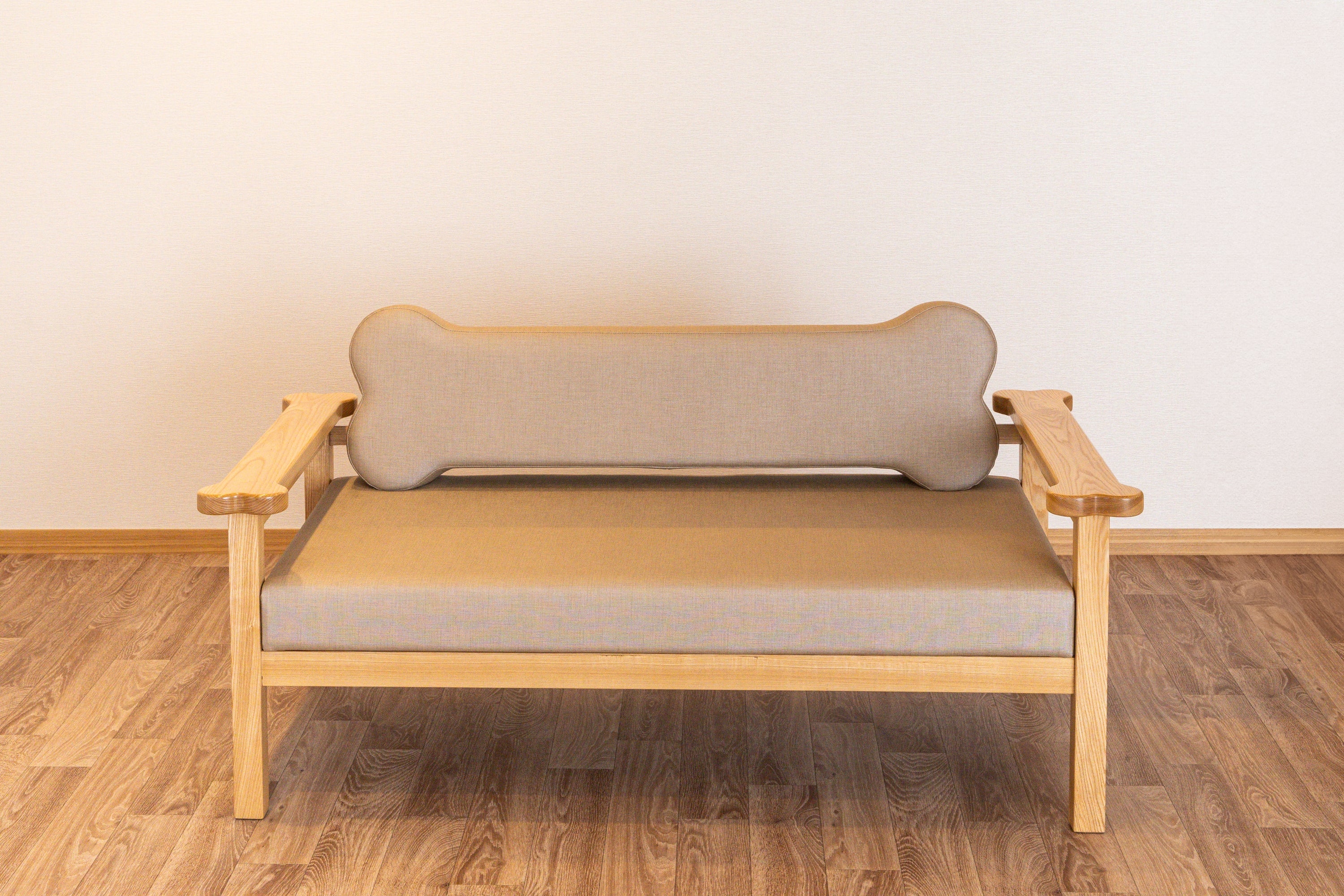 背もたれ部分、アーム部分を骨型の形状にして、ワンコと一緒に寛げるソファーをつくりました。表皮部分は専用ビニールレザーにして防汚効果や拭き取り可能な素材を使用しています。