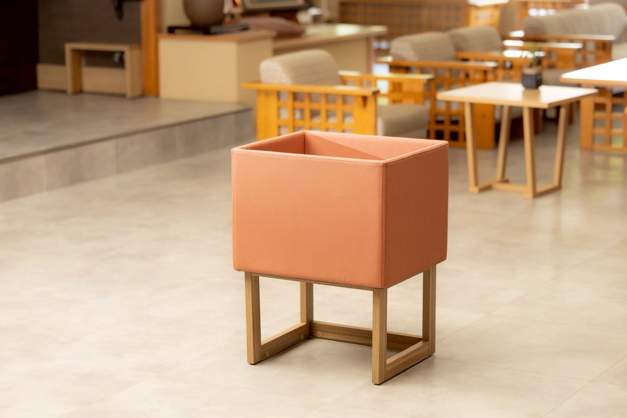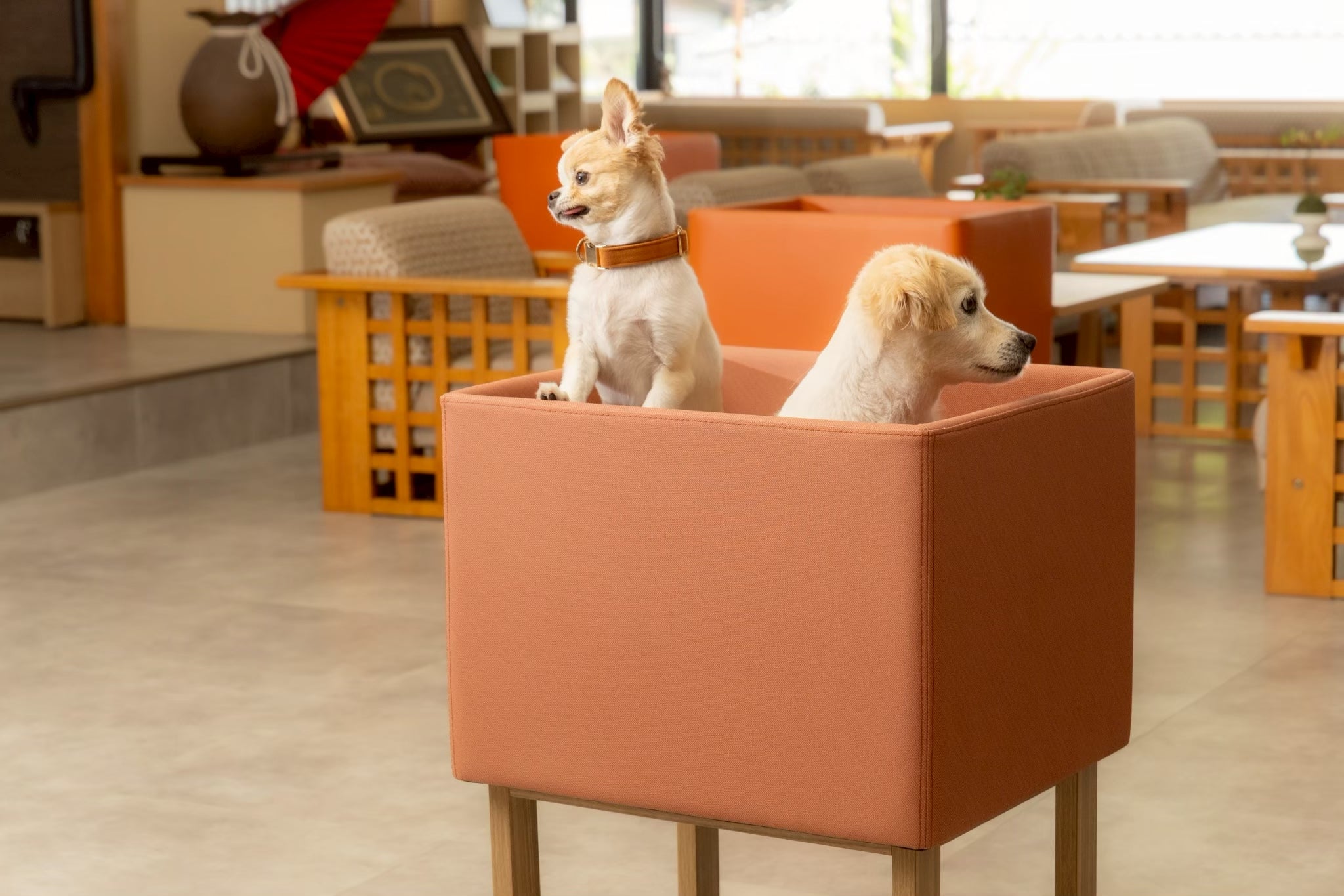 お食事時や来客時にワンコが歩き回らないように、落ち着いてお座りしてくれることを願った椅子になります。旅館のお食事処で一緒に過ごせるようにと依頼を受けてつくった椅子です。